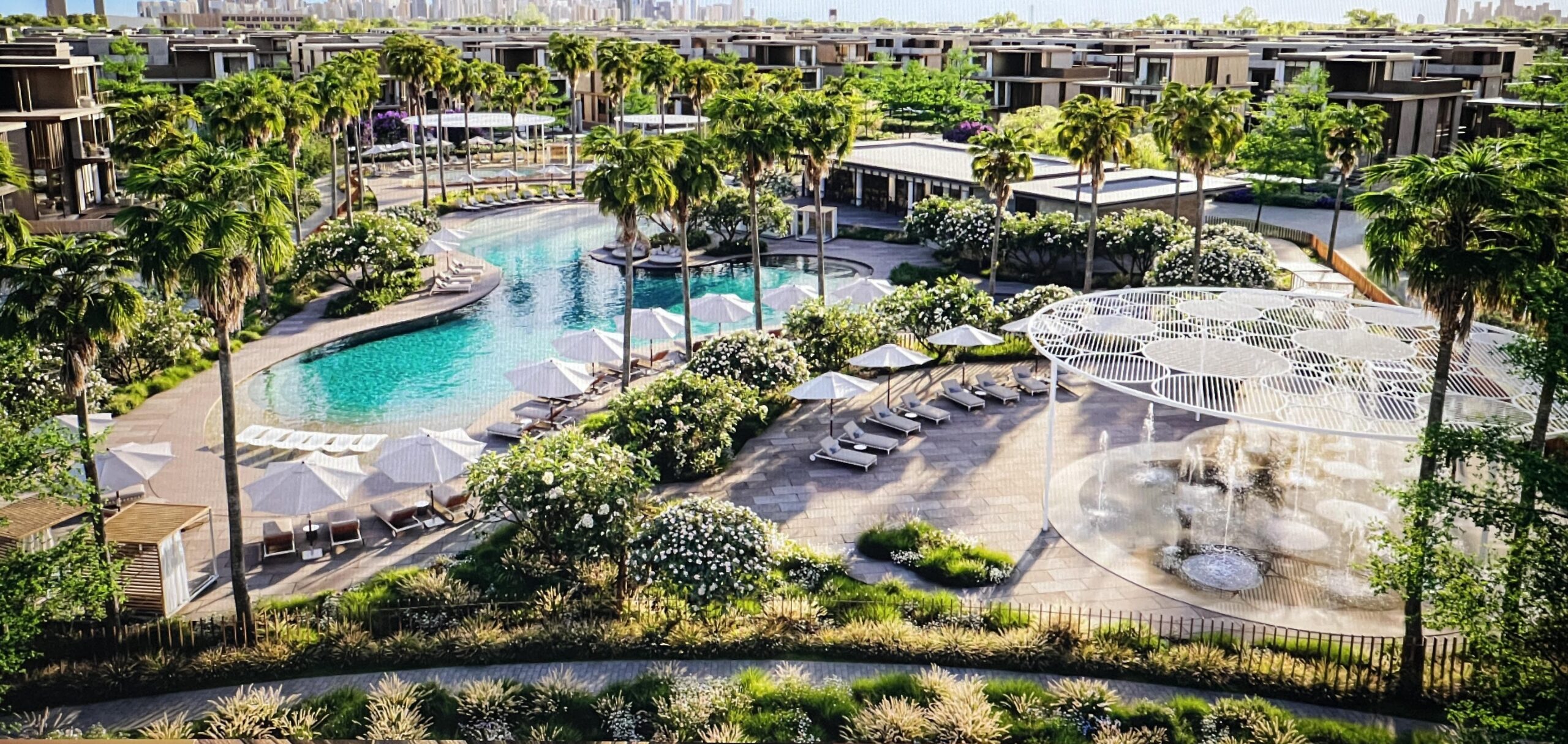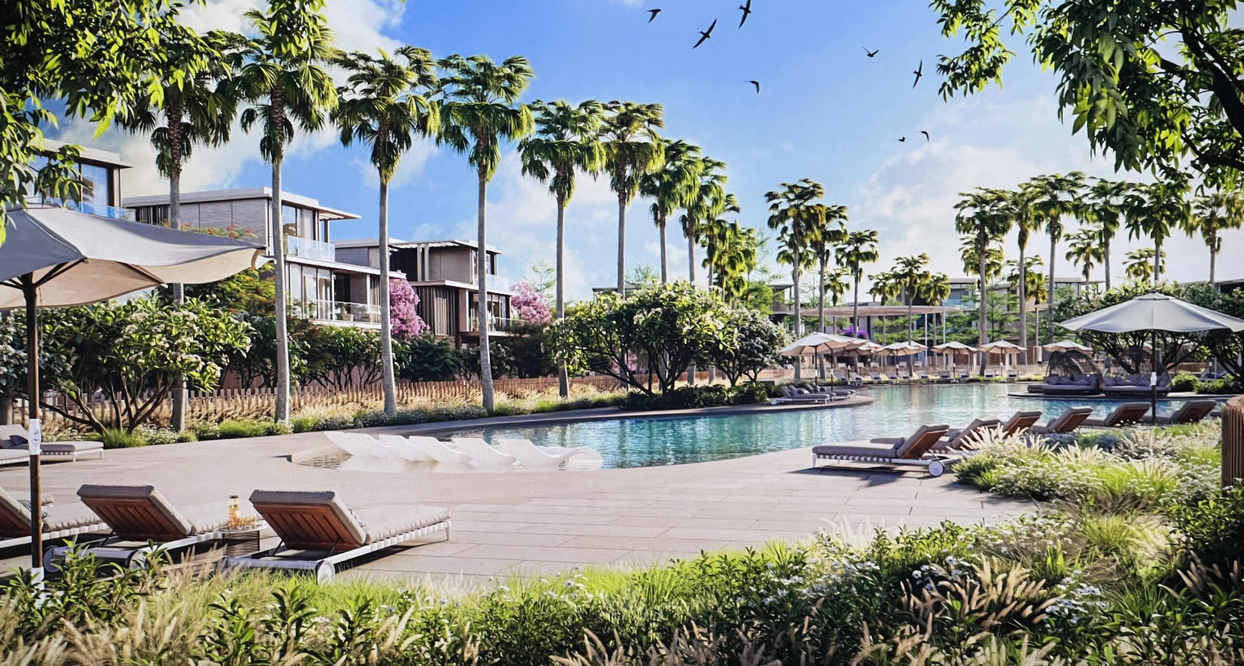 Lagoon-style beach pool surrounded by luxury villas with panoramic water and garden views. The cluster also includes one of the three Nad Al Sheba Gardens community gyms, further enhancing its exclusivity.